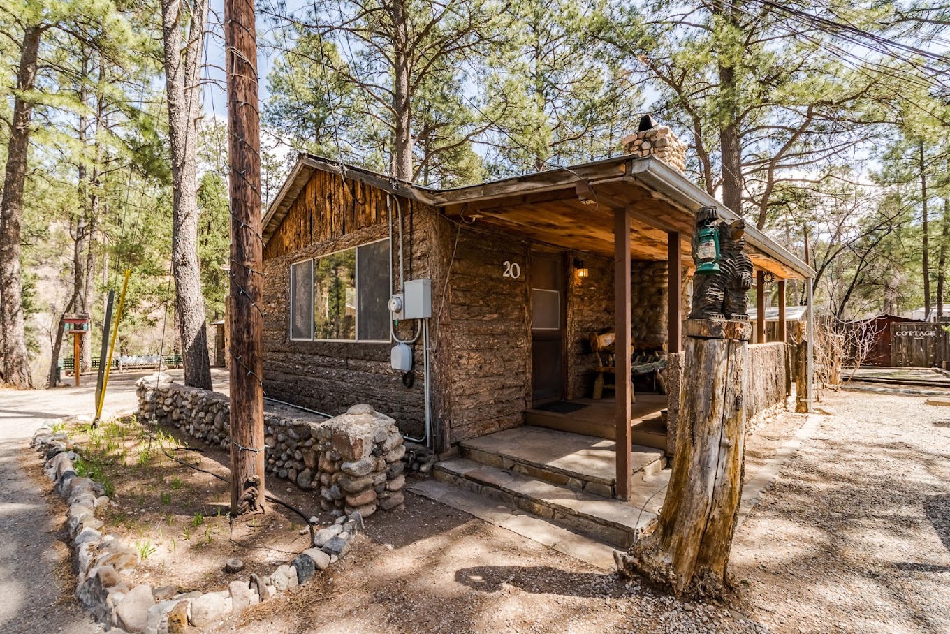 Take a step back in time with our rustic cabins. Our log cabins are dated back to the early 1940’s with all of today’s confront. Each cabin has its own quaint and home-like feeling, with no 2 cabins alike. We are centrally located in a cul-de-sac in the heart of midtown Ruidoso New Mexico.Surrounded with majestic Ponderosa Pines and beautiful mountainous scenery. We have a hiking trail at the back of our property that leads you down a small mountain side to the whistling Rio River and walking trails inside the Two Rivers Park, where if you look closely you can find little trolls and fairies hiding in the trees. If relaxing is more your style, you can kick back and play a fun game of horseshoes in our horseshoe pit right here on site. We are within walking distance of the Ruidoso Midtown shops,eatery and entertainment fun for everyone. From Lincoln County Grill’s Billy the Kid Burger to Backcountry Attitudes ATV rides you can’t beat staying with us and having all the best of Ruidoso right there at your convenience. We are 3.3 miles from the Inn of the Mountain Gods Casino, 3.9 miles from Billy The Kid Casino, 1.2 mile from Grindstone Stables and 1.1 mile from Grindstone Lake and the Cree Meadows Golf Course, 2.5 miles from Smokey Bear Ranger Walking/Hiking Trails,18.9 miles from Ski Apache.